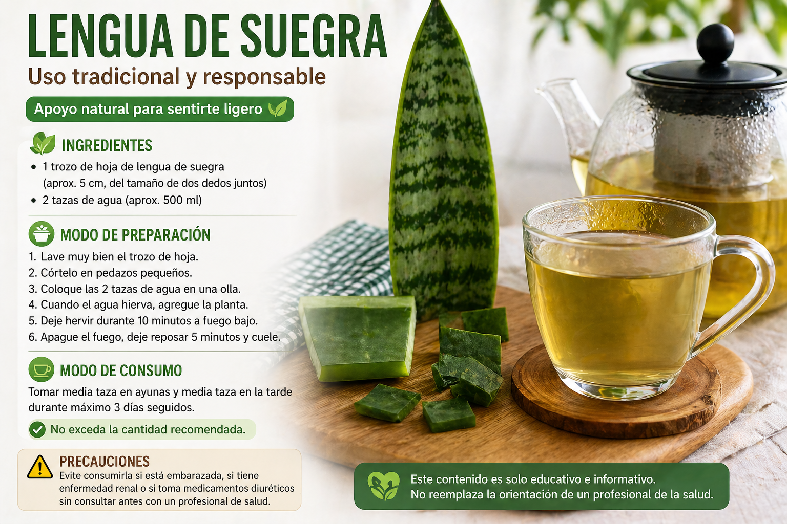 En algunos hogares, la planta conocida como “lengua de suegra” ha sido utilizada de forma tradicional como apoyo natural en rutinas de bienestar, especialmente en contextos relacionados con la sensación de hinchazón o retención de líquidos. Aunque estas prácticas forman parte del conocimiento popular, es importante abordarlas con criterio informado, entendiendo que no sustituyen la atención médica ni garantizan resultados específicos.