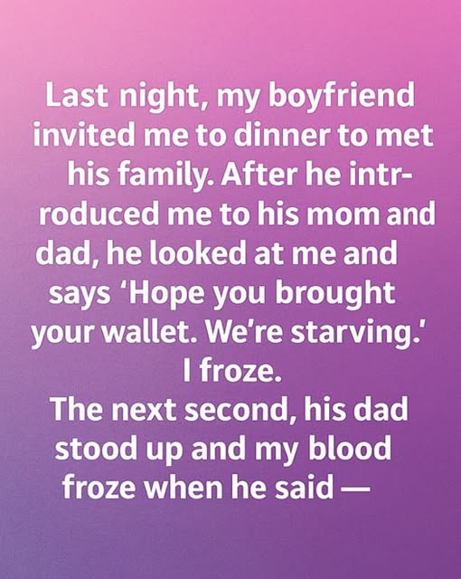 Meeting a partner’s family for the first time can feel like stepping onto a stage without a script. When my boyfriend invited me to dinner at his parents’ house, I spent hours preparing—choosing an outfit that felt polished but not overdone, rehearsing introductions, and reminding myself to stay calm. The house welcomed us with warm lighting, the aroma of home-cooked food, and cheerful conversation drifting from the dining room. Just as I began to settle in, my boyfriend joked that I should have brought my wallet because everyone was “extra hungry.” For a brief second, I froze—until his father laughed and assured me it was all in good fun. The playful teasing, though unexpected, was my first glimpse into their family dynamic.